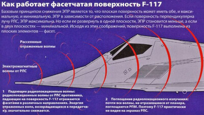 Именно поэтому «стелс»- самолёты почти всегда имеют конструкцию из плоских поверхностей и резких углов — они тоже отражают сигналы радаров, но не напрямую к приёмнику[8].